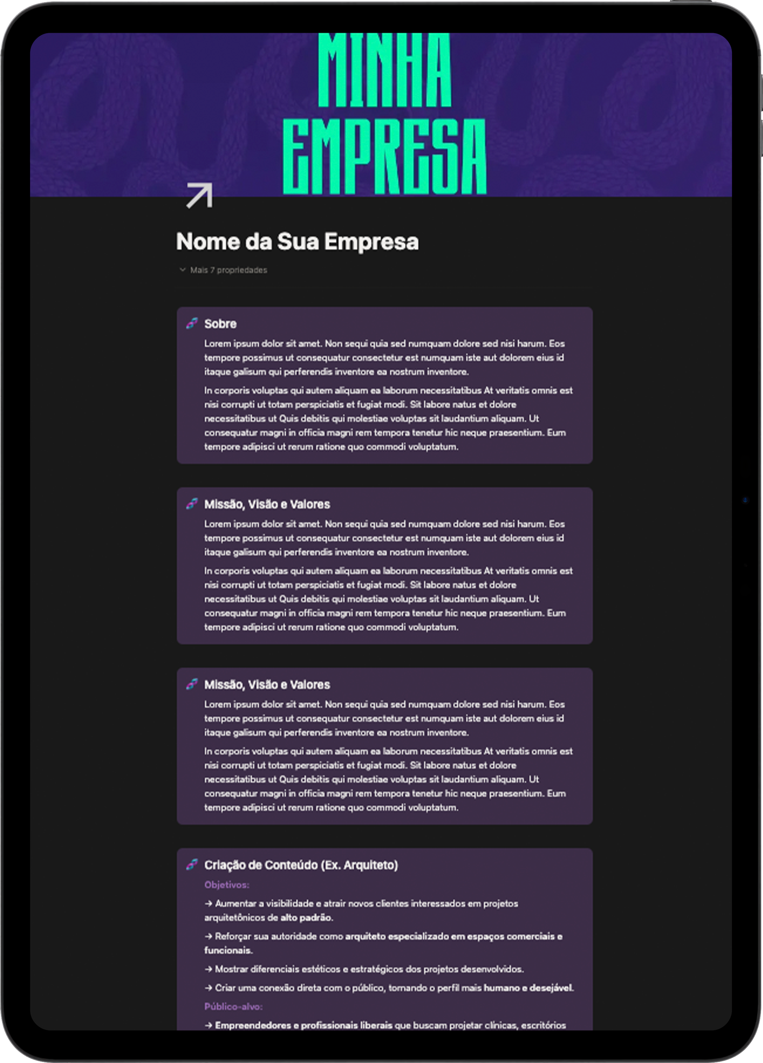 O template Minha Empresa foi criado para freelancers e pequenas agências que precisam de clareza, estrutura e visão estratégica no dia a dia.