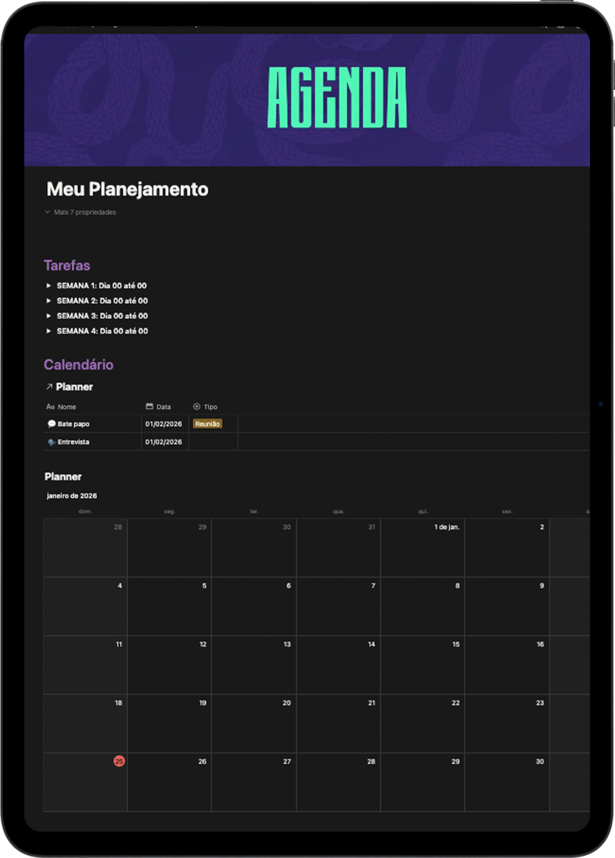 Com o template Agenda Meduza, você centraliza compromissos, prazos, entregas e projetos em um único sistema inteligente.